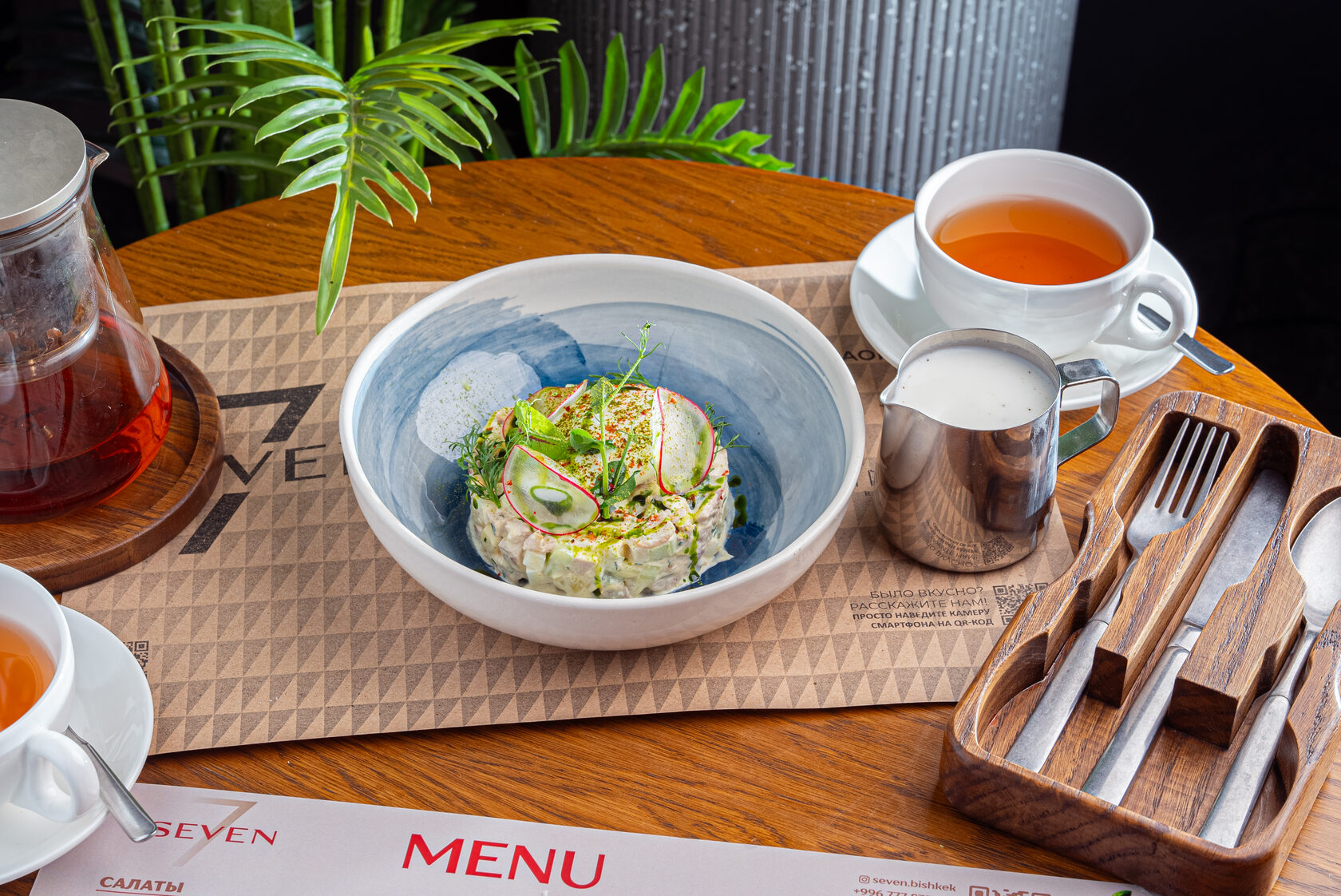Ароматный борщ на наваристом бульоне с нежными телячьими щечками, подается со сметаной и свежей зеленью.