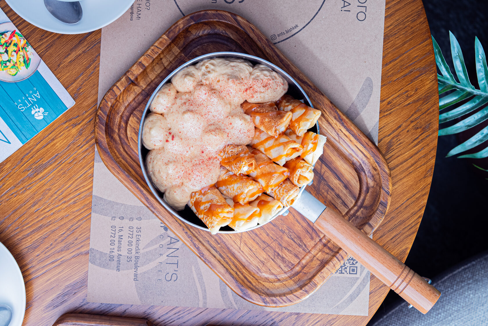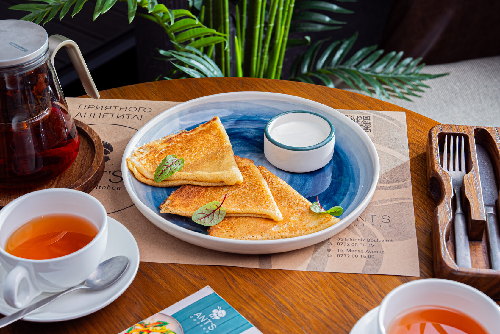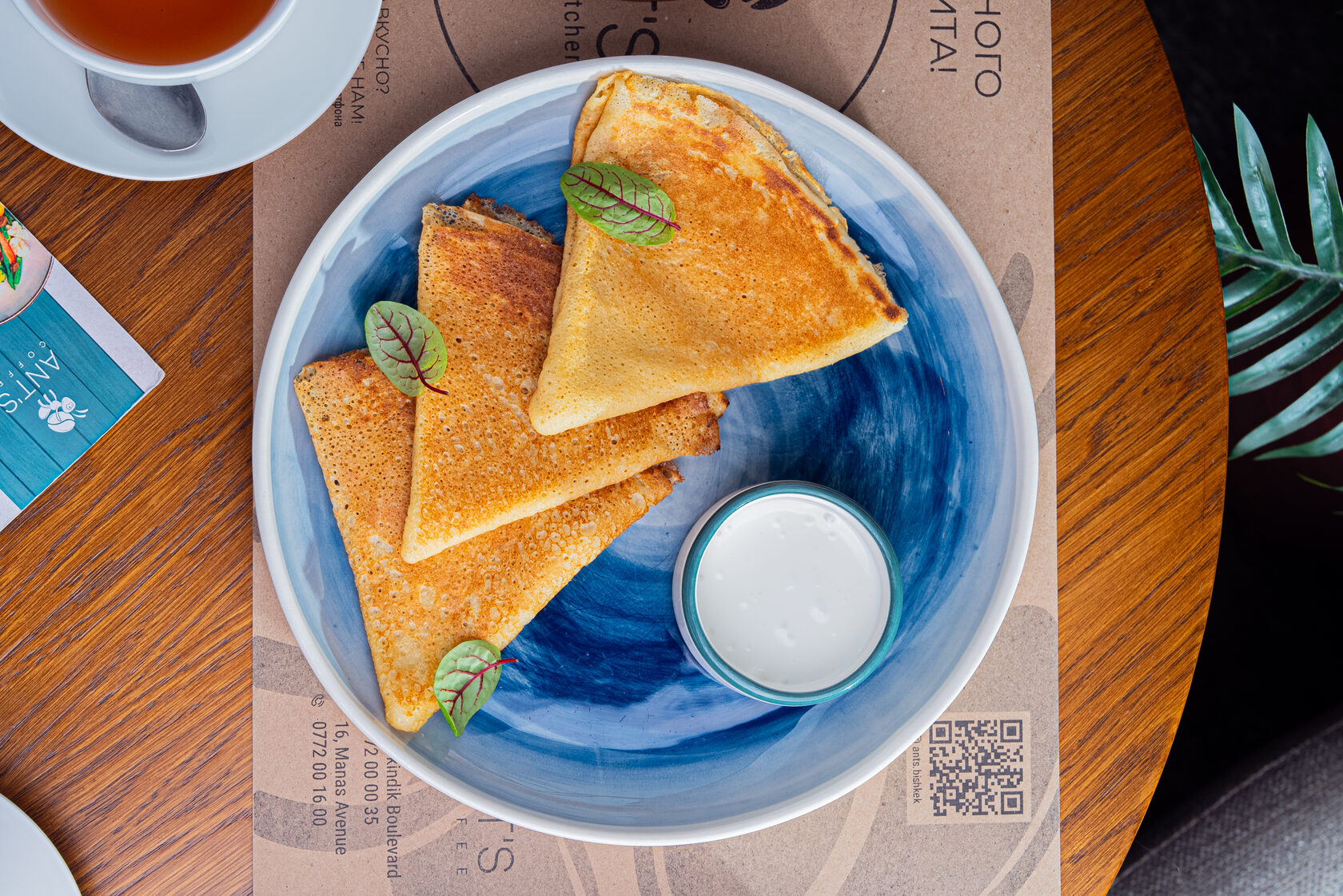 Блины – горячие, только что приготовленные блины с выбором топпингов: сметана, сгущенное молоко, шоколад, кленовый сироп и мед.