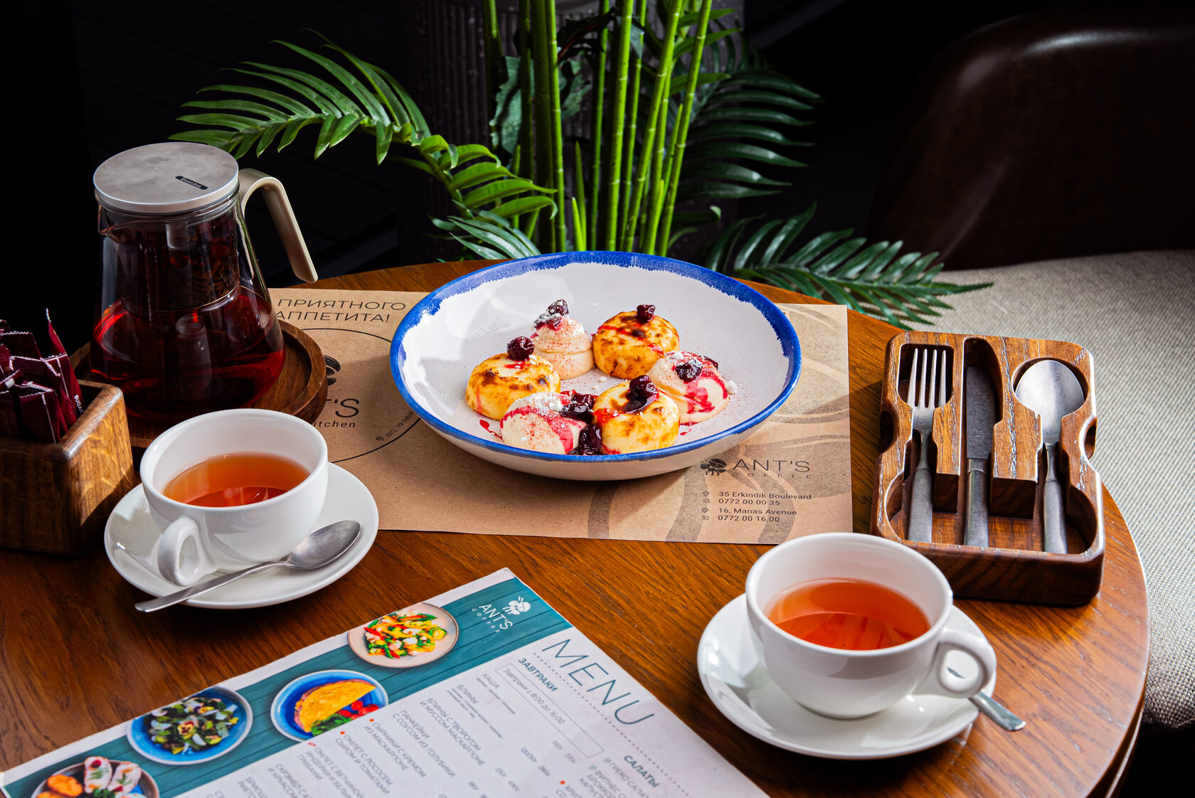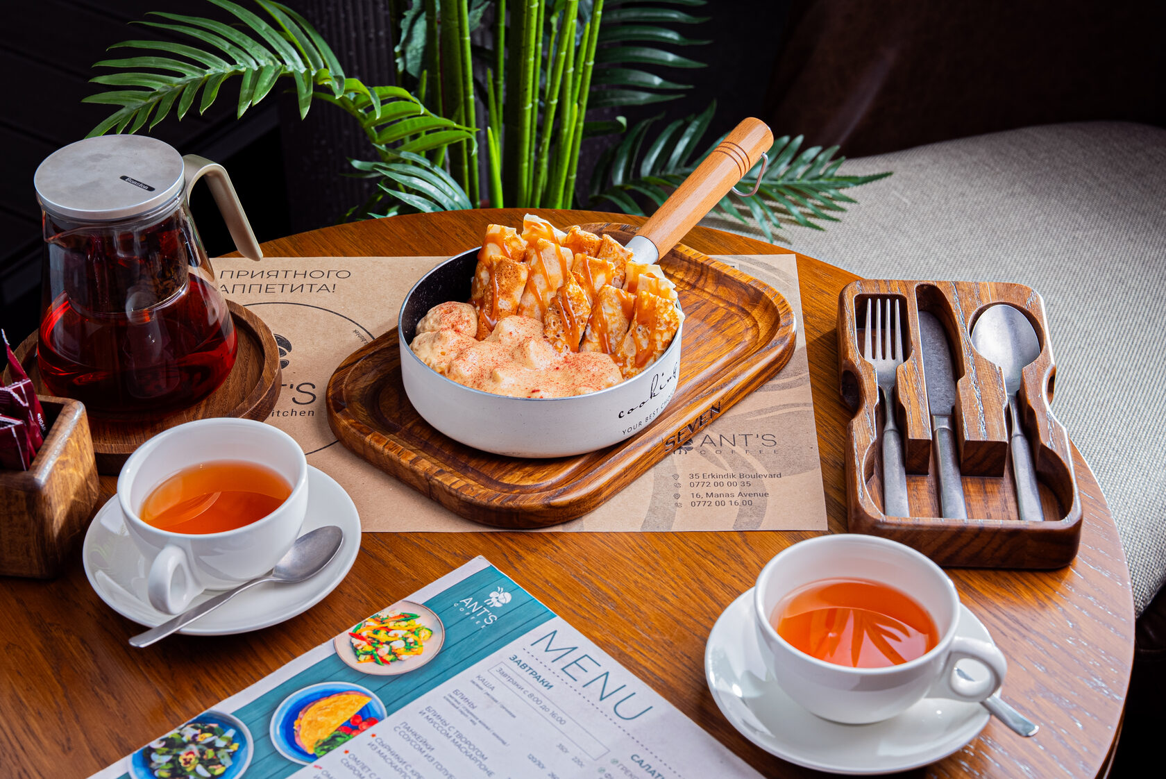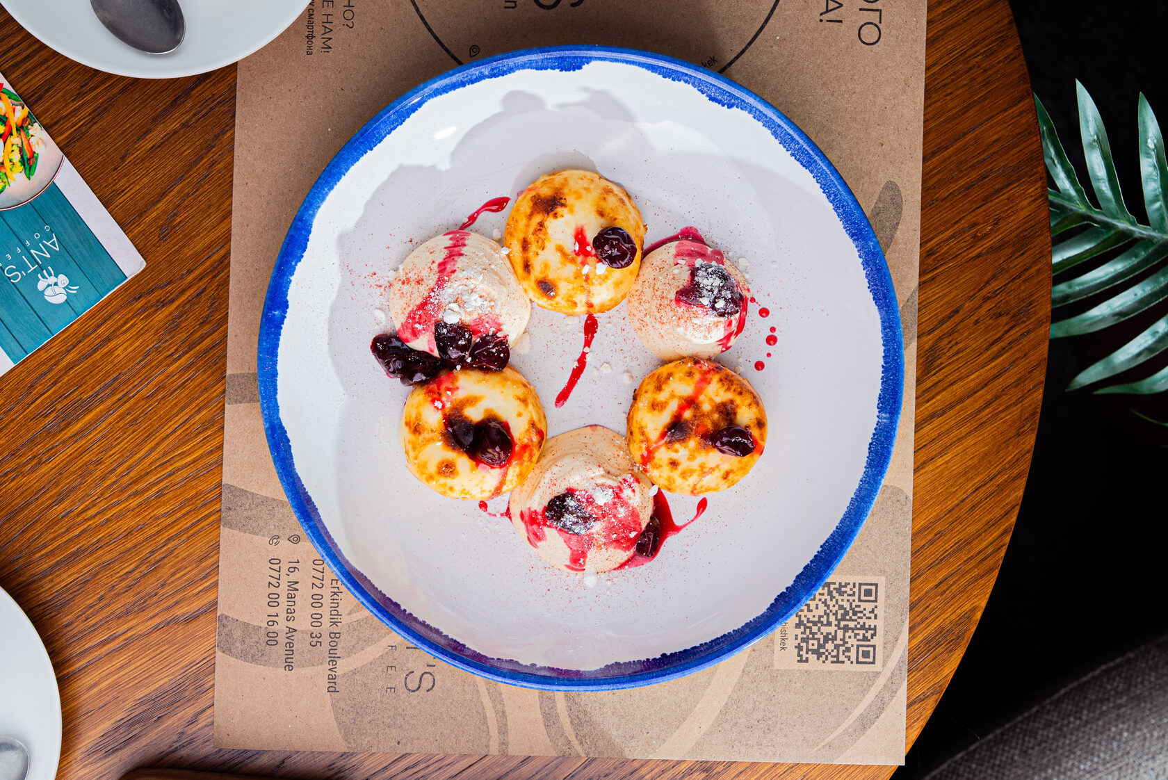 Блины – горячие, только что приготовленные блины с выбором топпингов: сметана, сгущенное молоко, шоколад, кленовый сироп и мед.