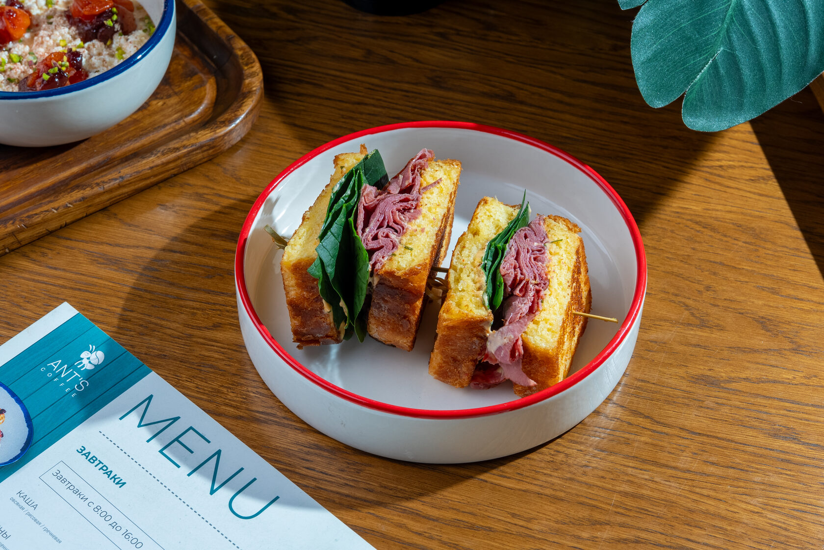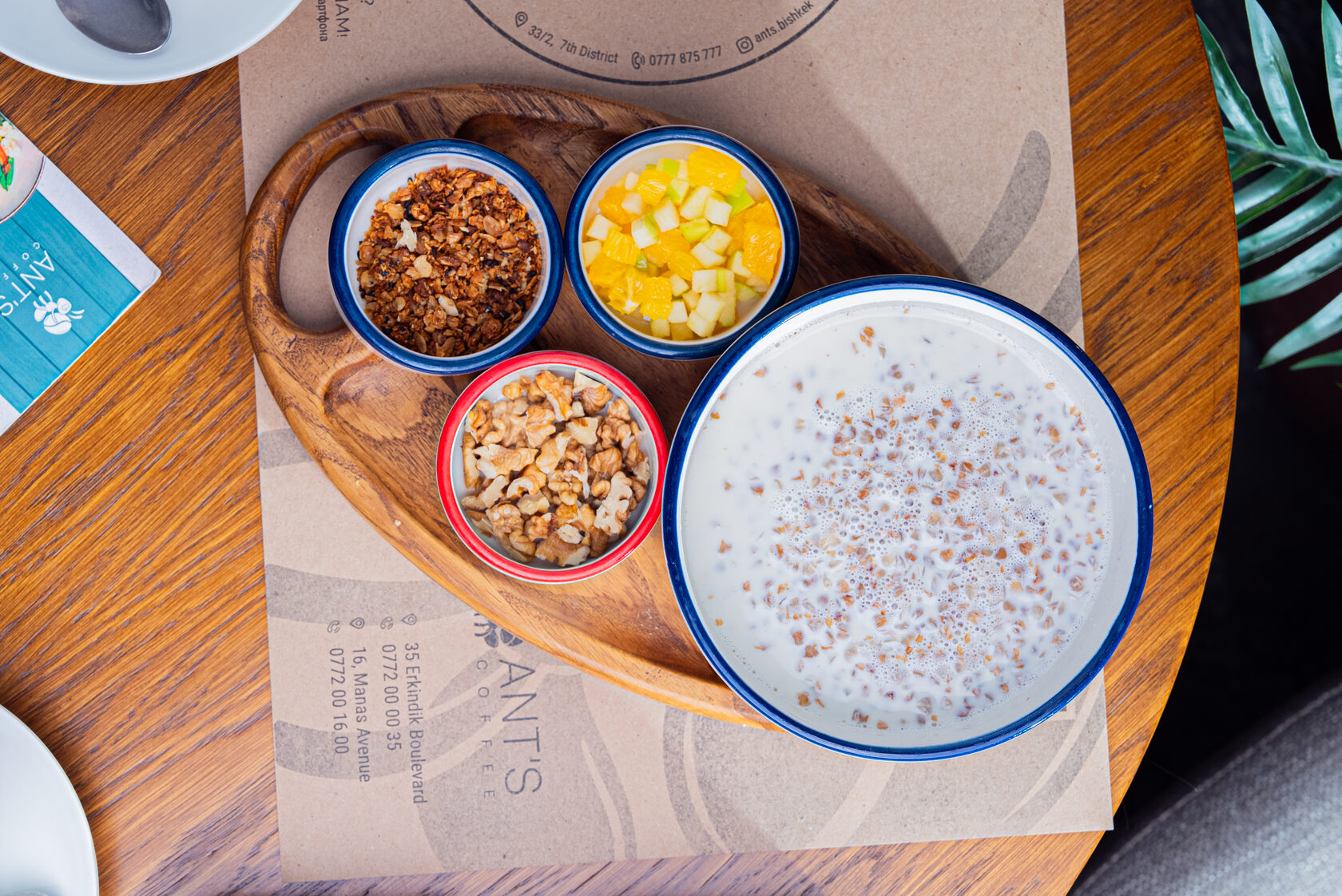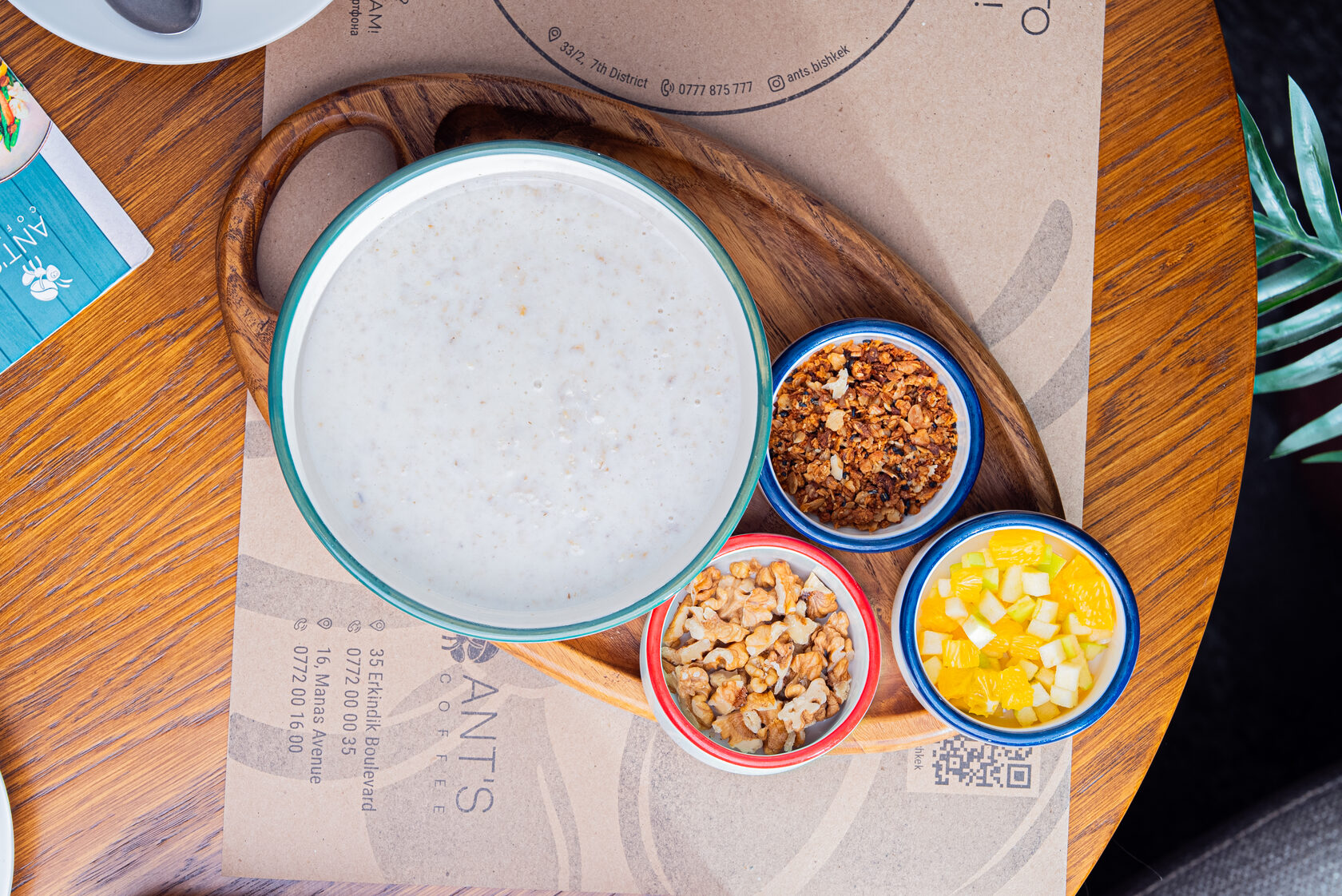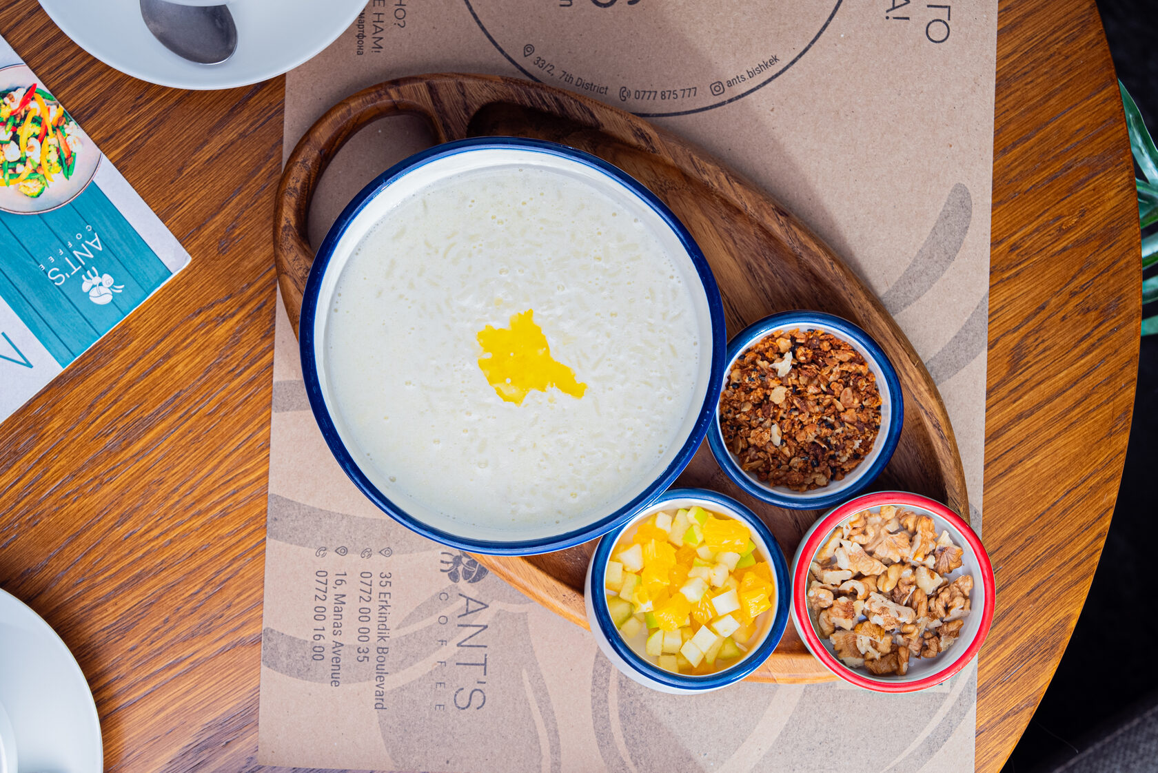 Каша – рис, гречка или овсянка, приготовленные на молоке, воде или кокосовом молоке, с добавлением сливочного масла. Подается с гранолой, орехами и свежими фруктами по сезону.