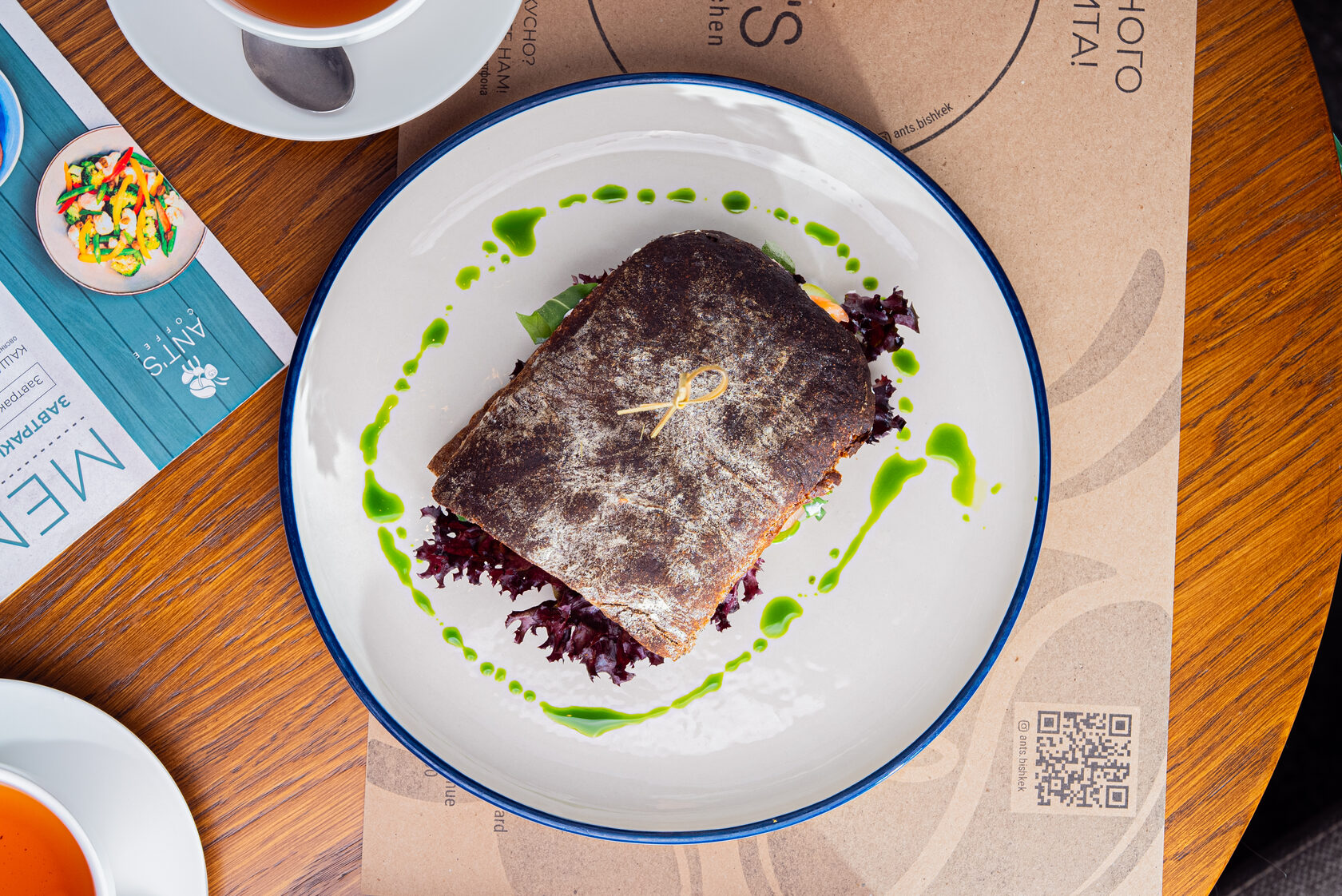 Сэндвич с крем-чизом – черная чиабатта с нежным крем-сыром, лососем слабой соли, свежими огурцами, жареным луком и рукколой. Подаётся с кунжутным миксом и бальзамическим уксусом, а также свежим миксом салата.