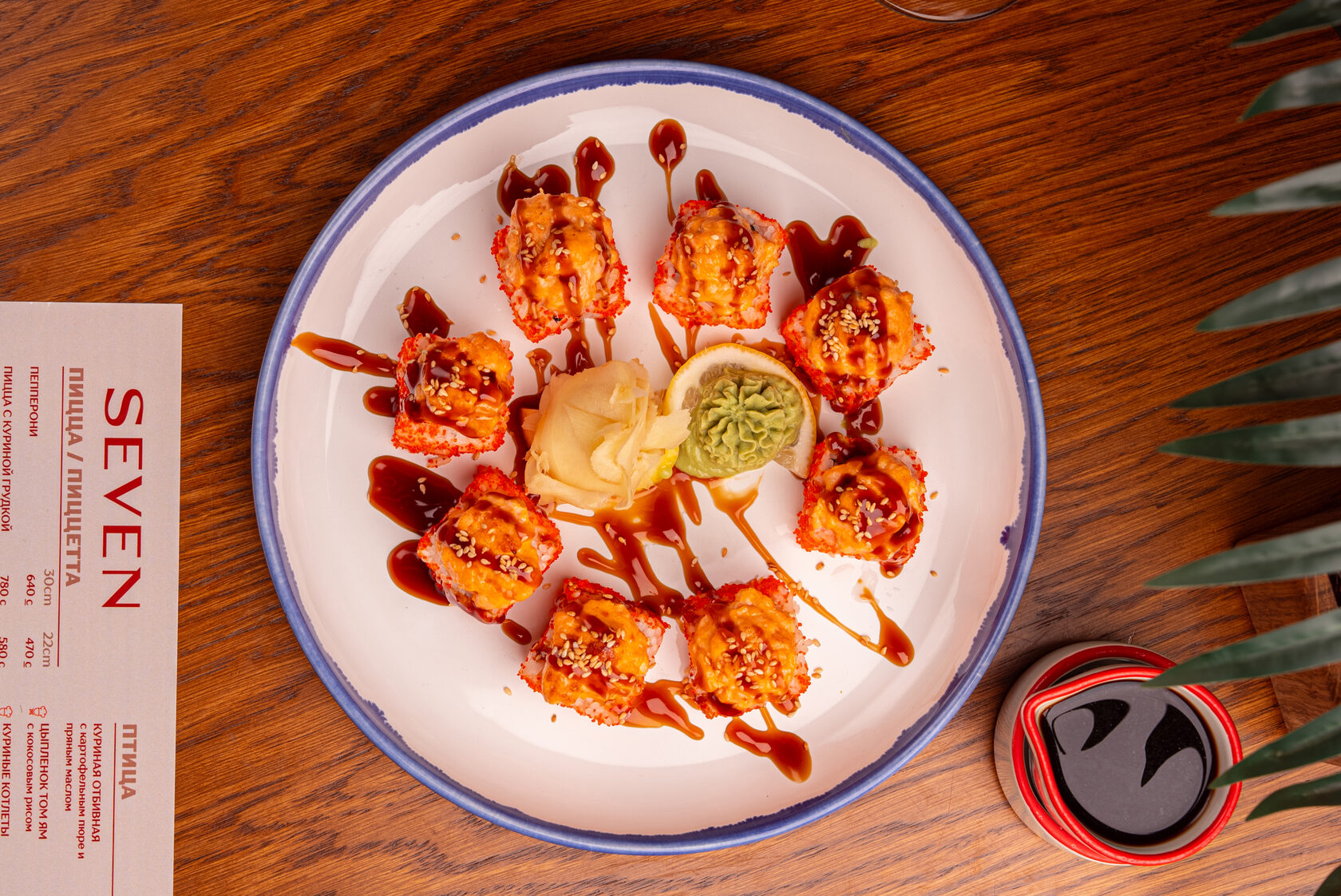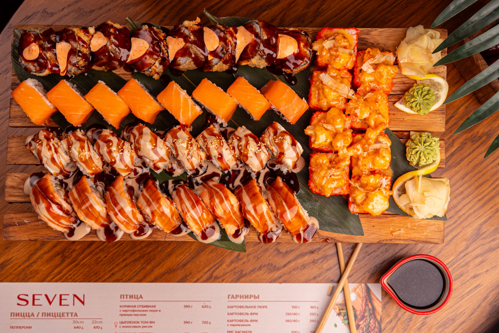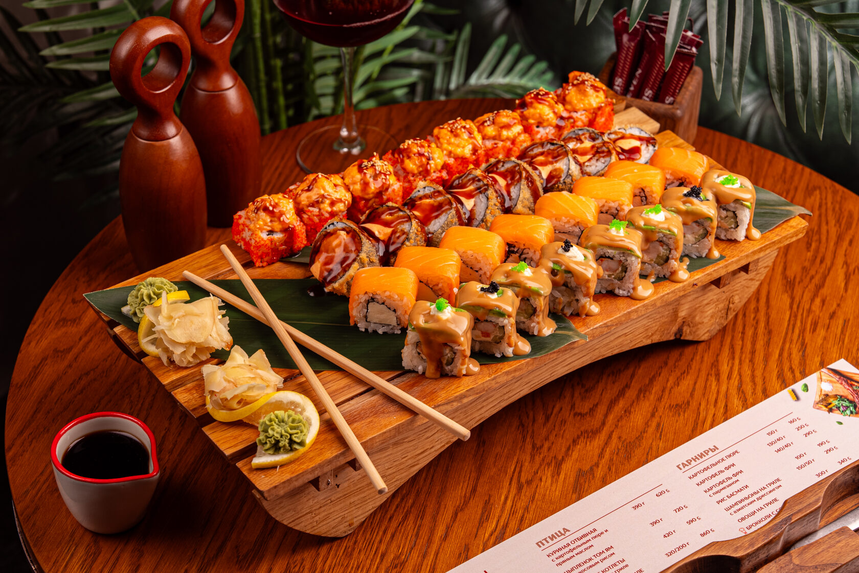 филадельфия, ролл с угрём и такуаном, ролл с попкорном из креветок, запечённый ролл с лососем и цыплёнком терияки, темпер ролл с креветками