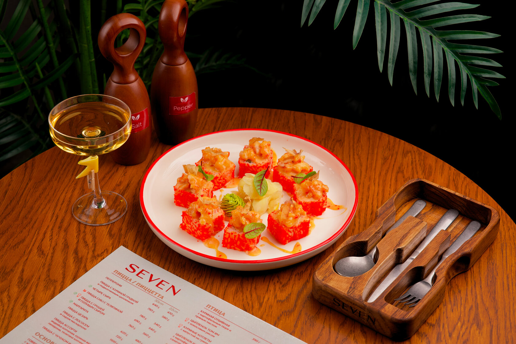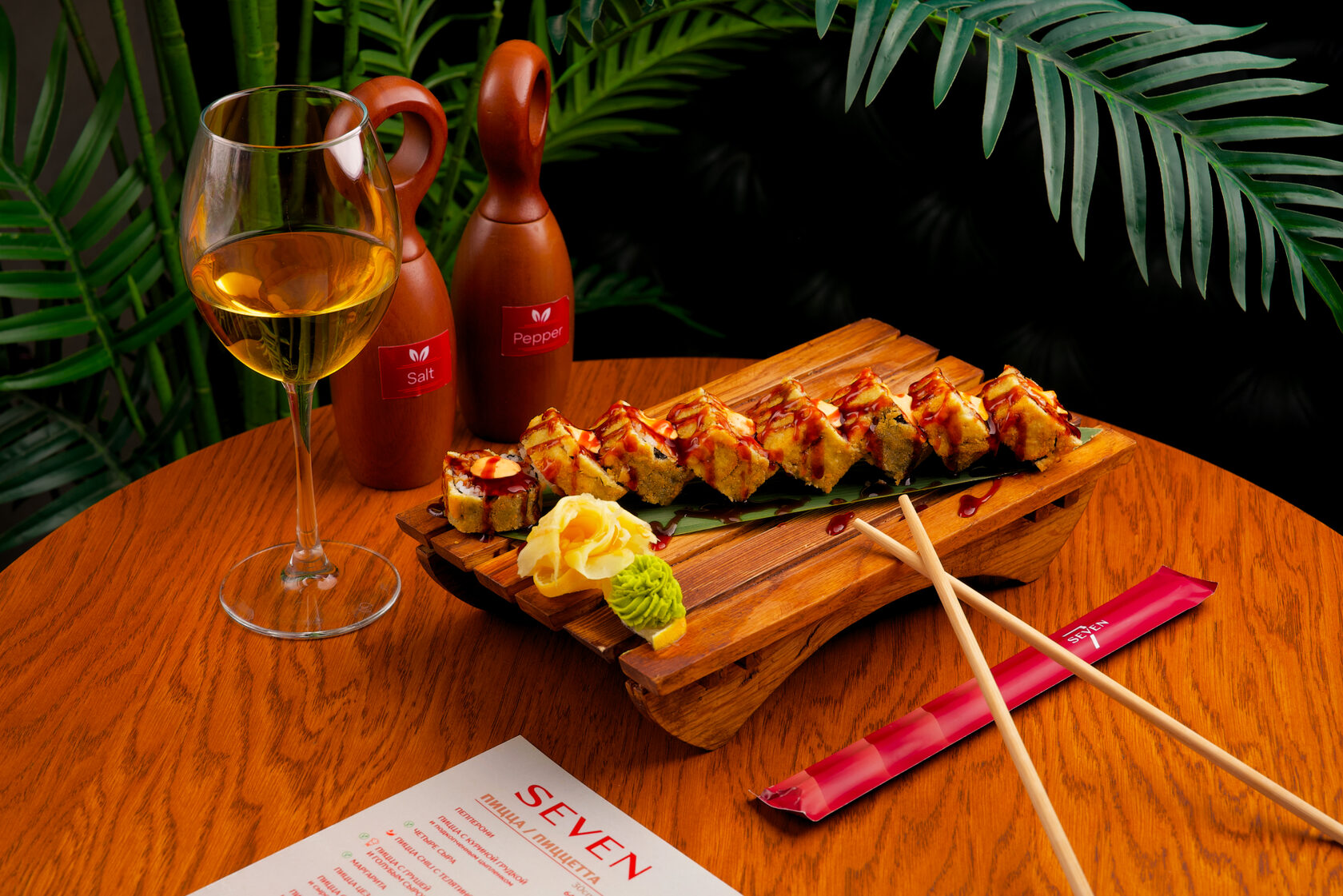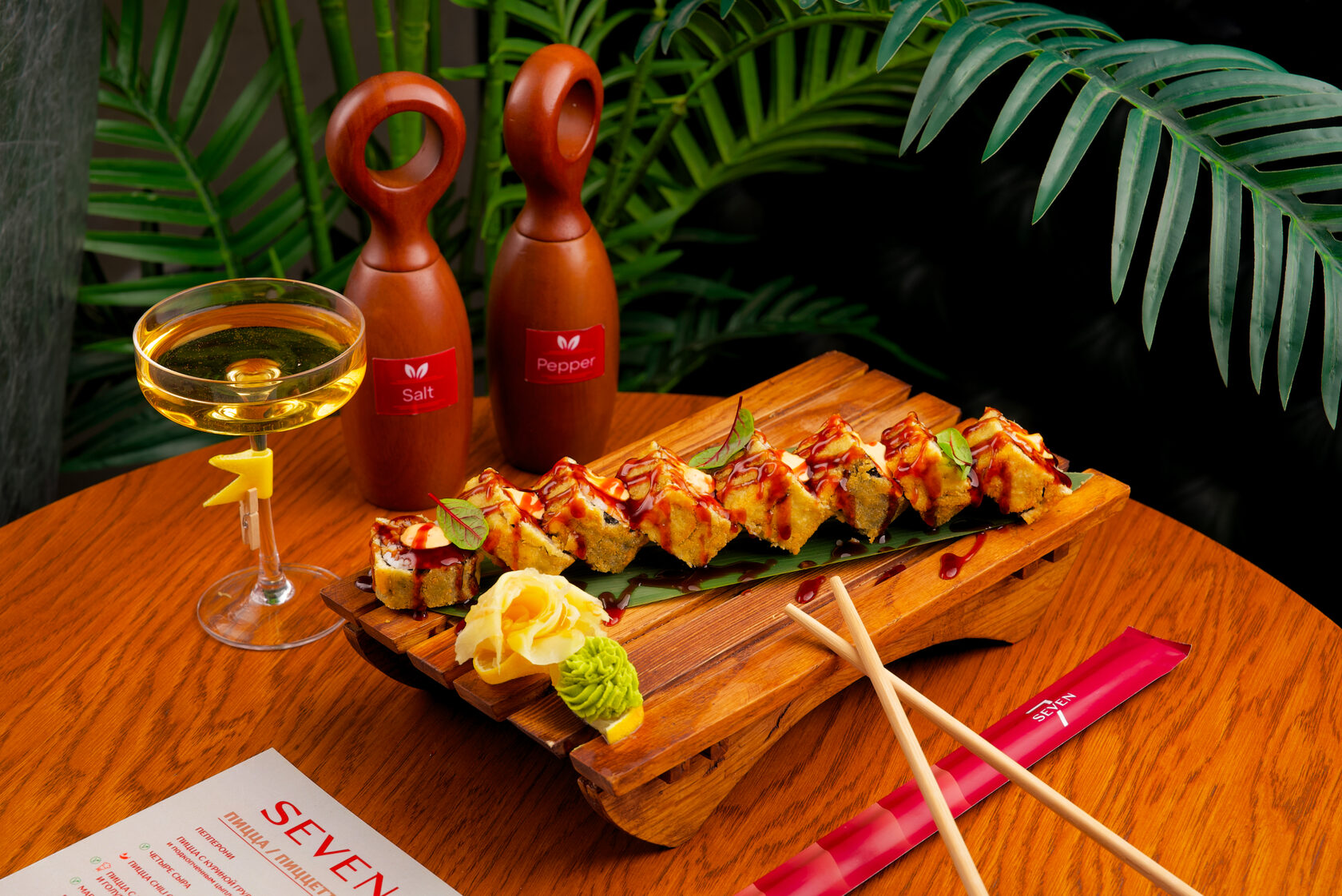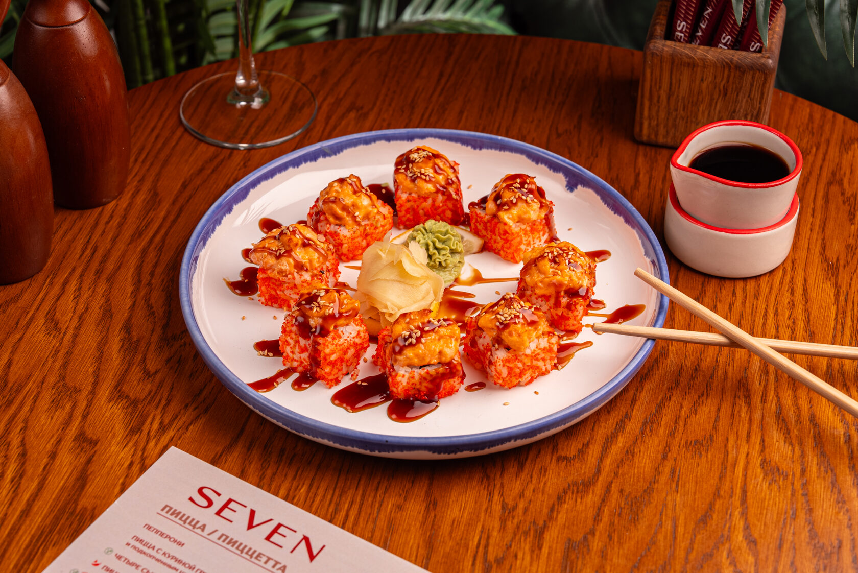 филадельфия, ролл с угрём и такуаном, ролл с попкорном из креветок, запечённый ролл с лососем и цыплёнком терияки, темпер ролл с креветками
