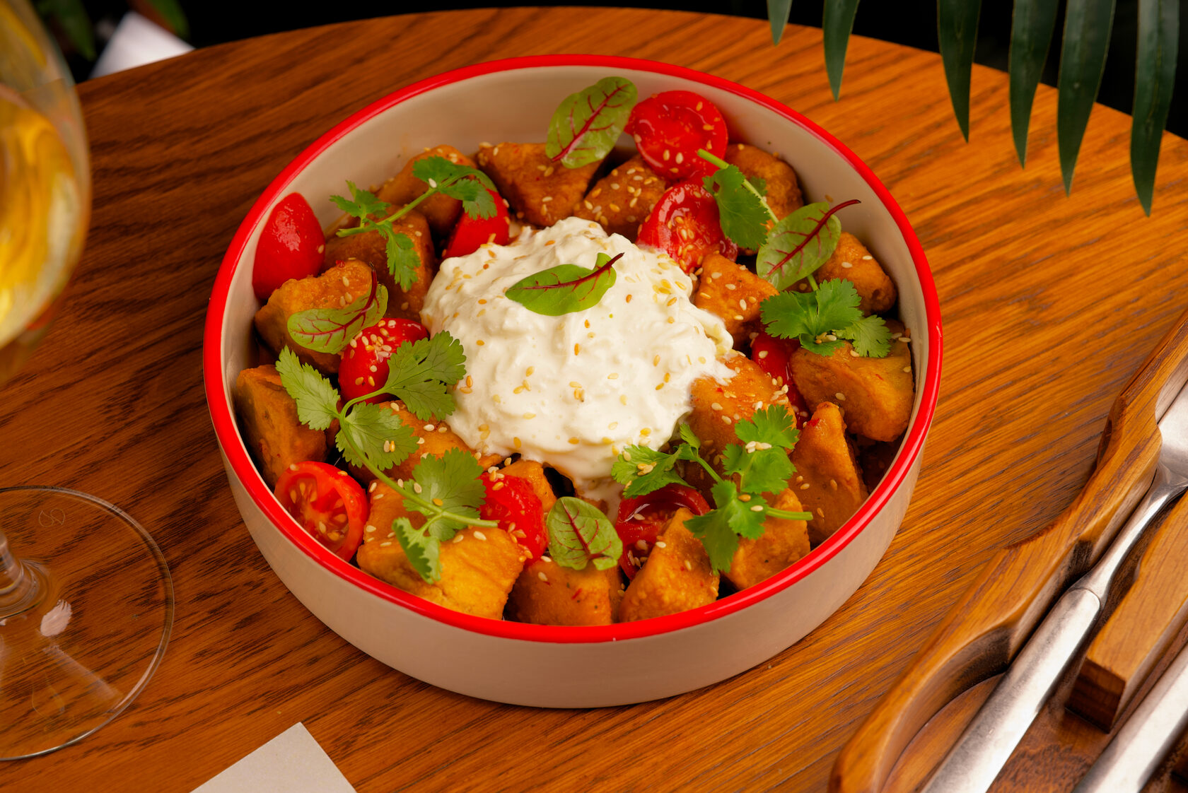 Запечённый ролл с лососем, цыпленком терияки и соусом из кешью — ролл с нежным лососем и сочным цыпленком, пропитанный ароматным соусом терияки, запечённый до золотистой корочки, с кремовым соусом из кешью, придающим блюду насыщенный и ореховый вкус.