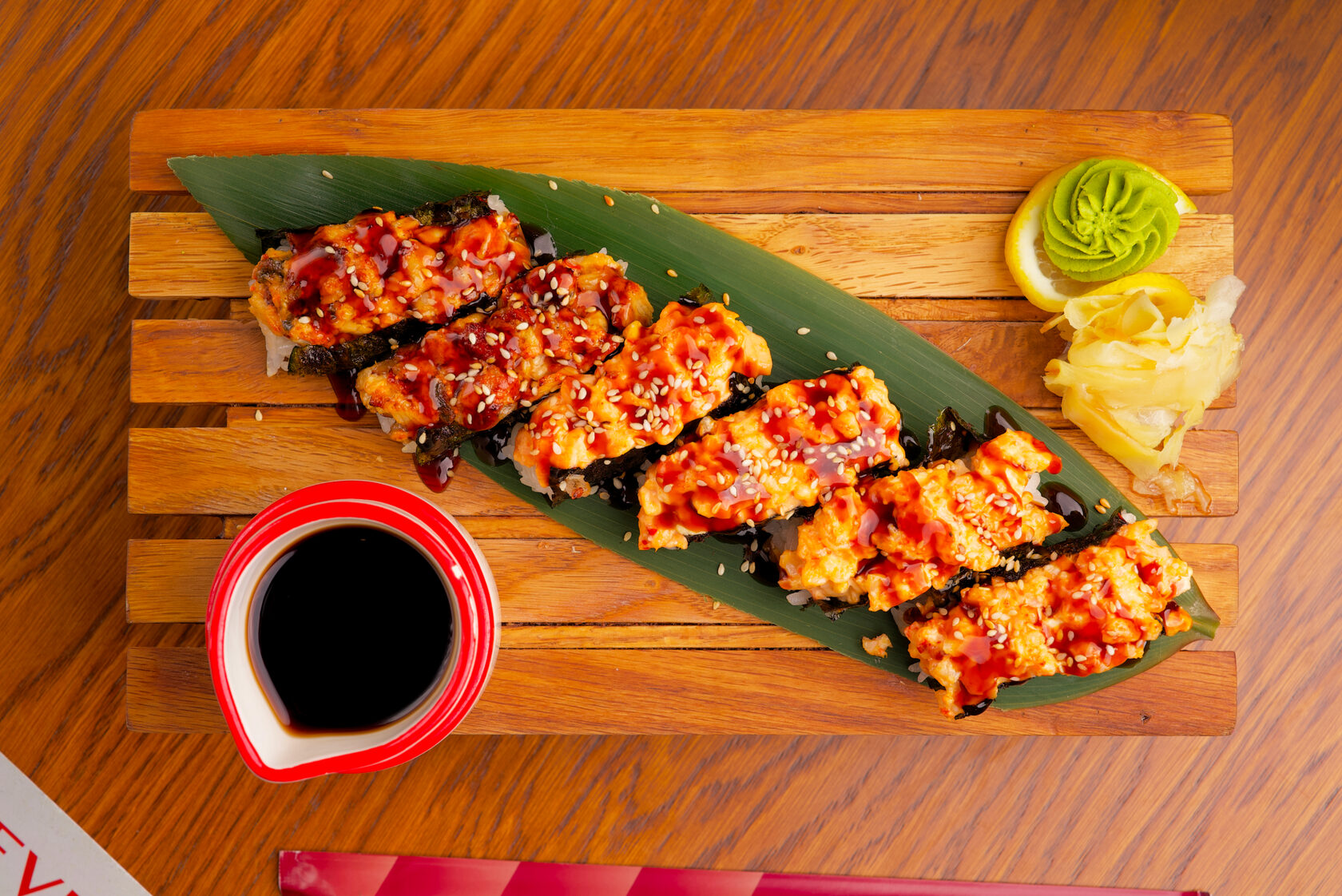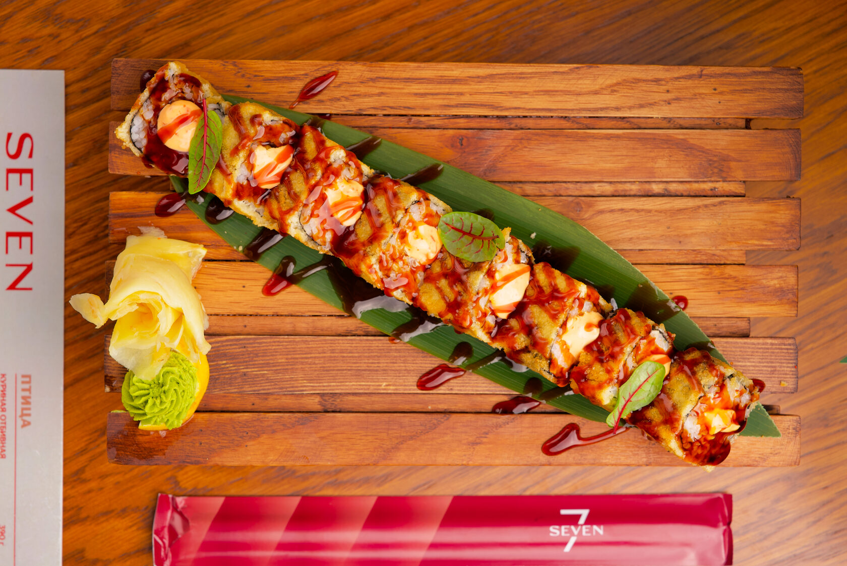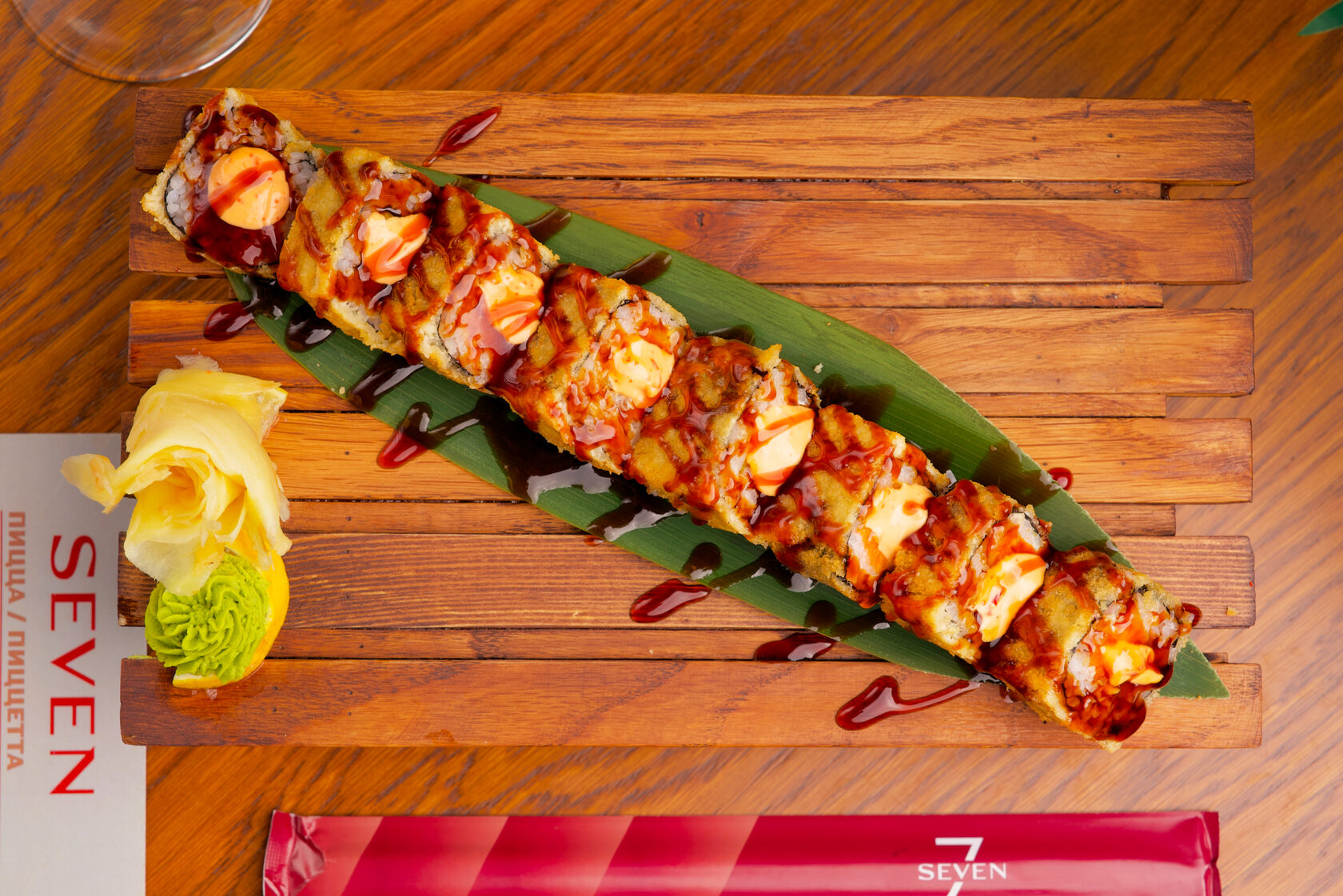 Запечённый ролл с угрём и лососем — ролл с нежным угрём и сочным лососем, запечённый до золотистой корочки, с мягким кремом и легким соусом, создающим гармонию вкусов и текстур.