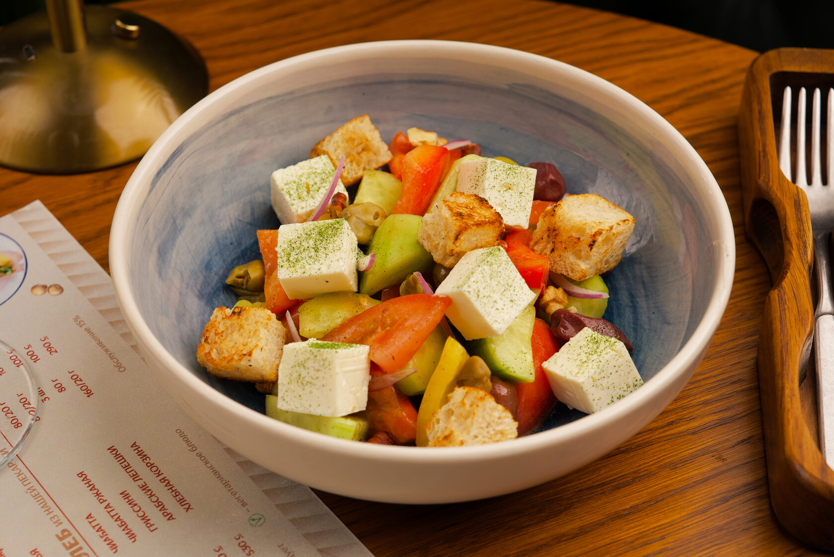 Греческий салат — это классическое блюдо средиземноморской кухни, состоящее из свежих овощей, таких как помидоры, огурцы, красный лук и перец. Салат обычно включает оливки, фету (или другие сыры) и заправляется оливковым маслом, лимонным соком и орегано. Этот салат отличается простотой и яркими, свежими вкусами.