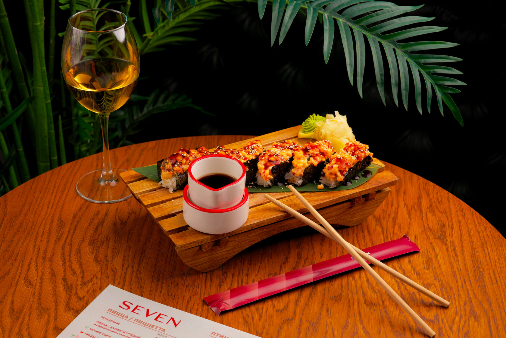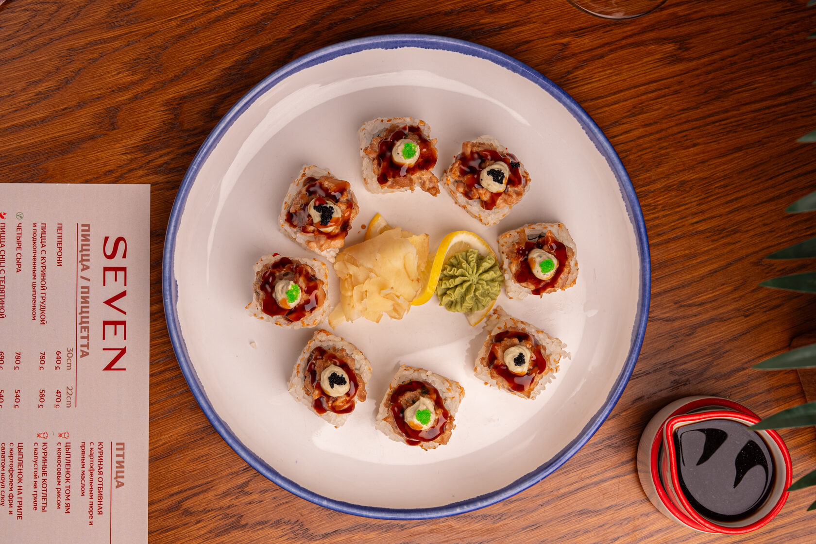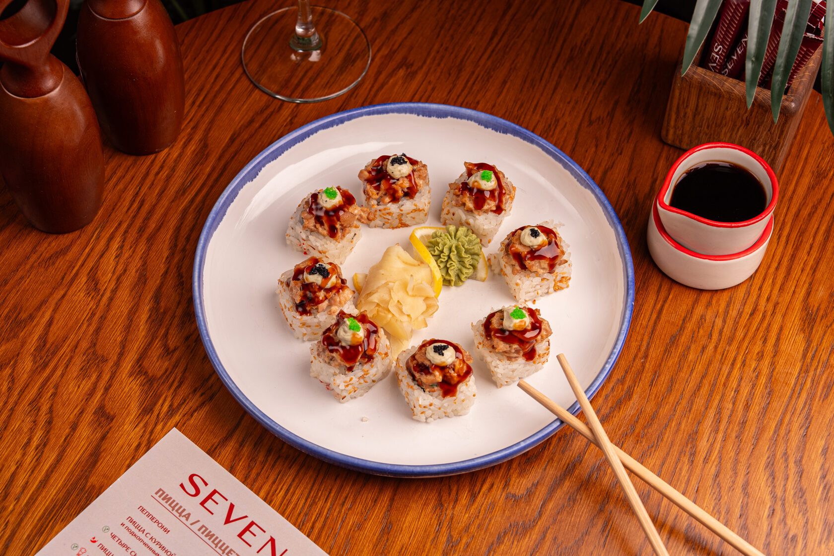 Ролл с угрём и такуаном, ролл с курицей, ролл с лососем, манго и свежей голубикой, ролл с креветками и авокадо, филадельфия, ролл с попкорном из креветок