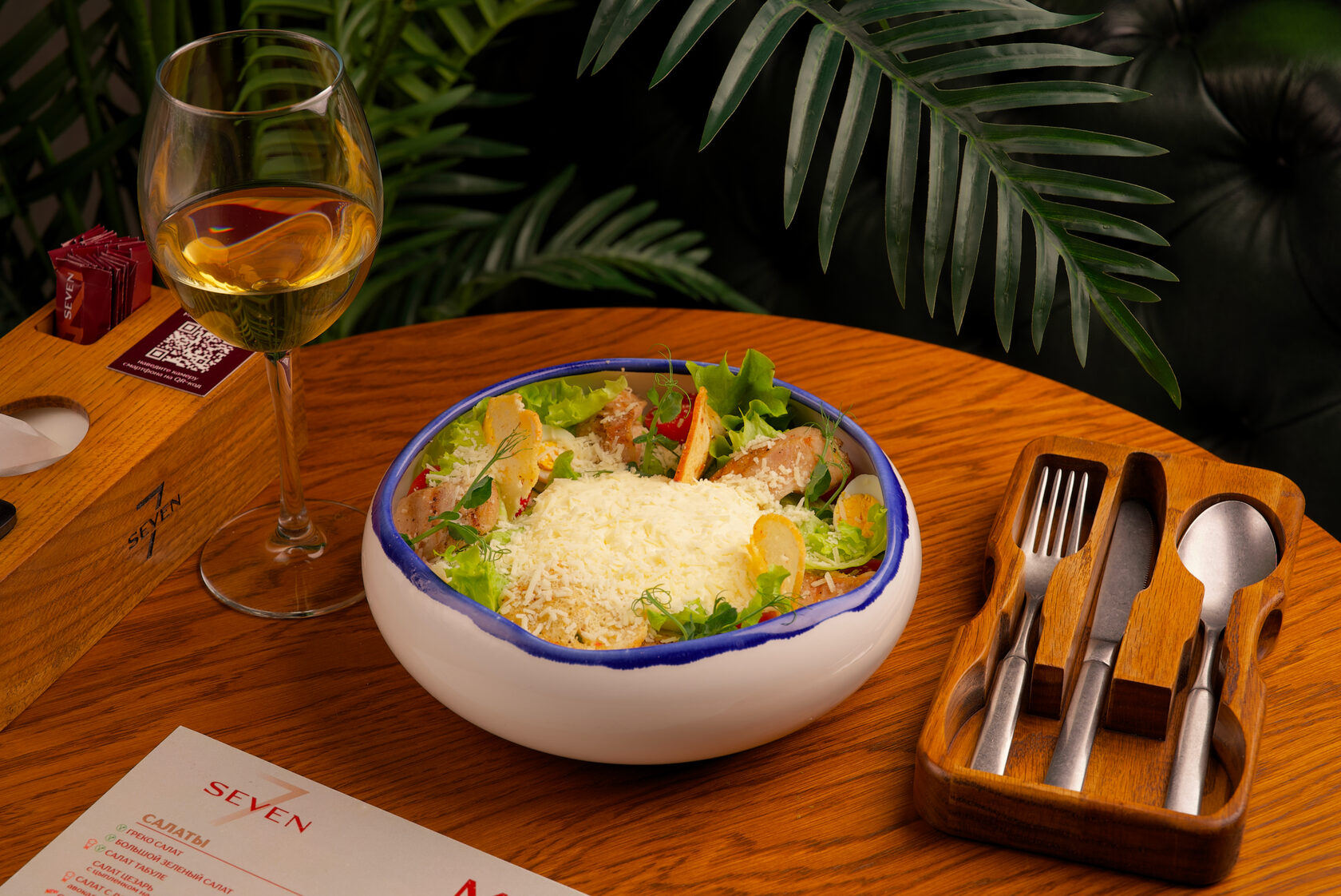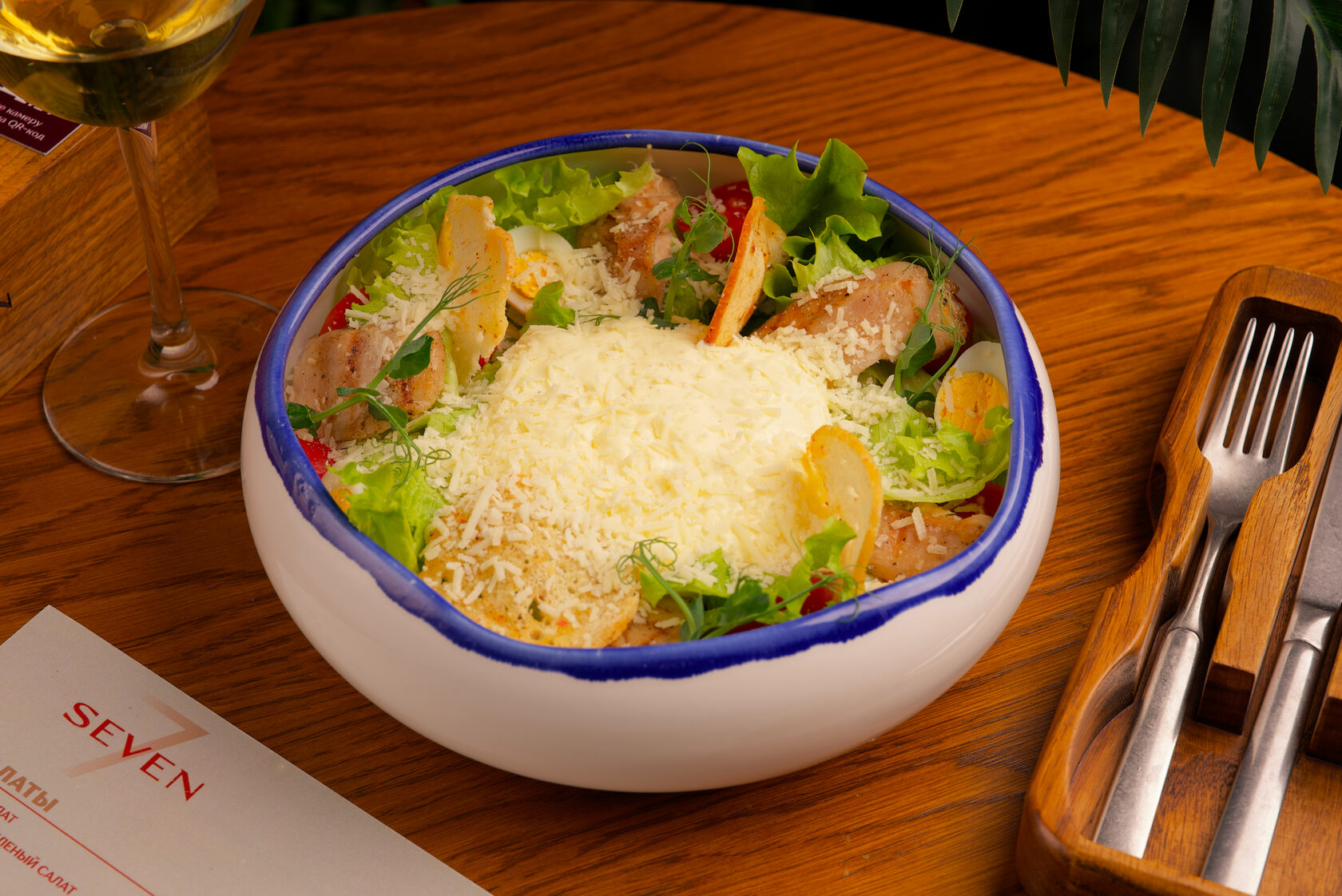 Салат Цезарь с цыпленком на гриле — это классический салат с хрустящими листьями римского салата, покрытые кремовым соусом Цезарь, с добавлением ароматных кусочков курицы, приготовленных на гриле. Салат дополняют хрустящими крутонами, тёртым пармезаном и иногда оливками или анчоусами, создавая гармоничное сочетание вкусов.