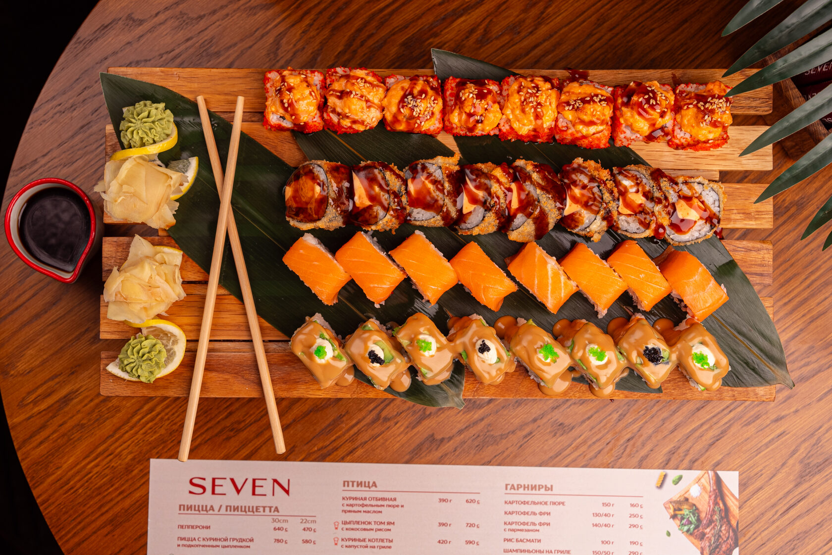 филадельфия, темпер ролл с лососем и угрём, ролл с креветками и авокадо, запечённый ролл с угрём и лососем